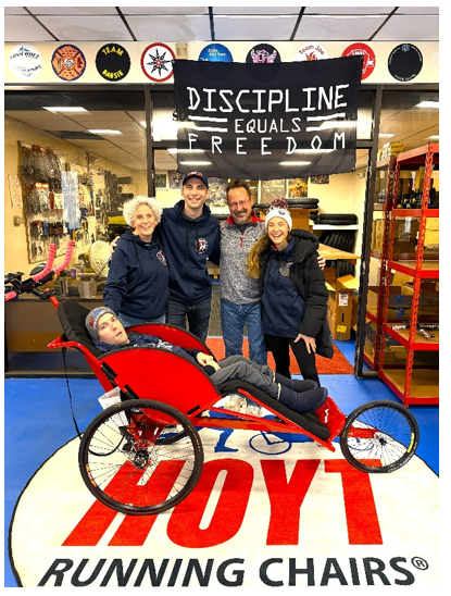 James Anderson and Rusty Wilkins TEAM RUSTY have been selected to be the Honorary Team Hoyt Duo to run the Boston Marathon as part of the Team Hoyt Charity Team. Rusty, his mom and James joined Russ and Amy at Hoyt Running Chairs for a special surprise! Mike DiDonato and his son Mike Jr. shared with Team Rusty that they are building a custom designed chair for them just for Boston! They get to pick the colors, decals and wheel covers. This is going to be an amazing chair for an amazing pair.