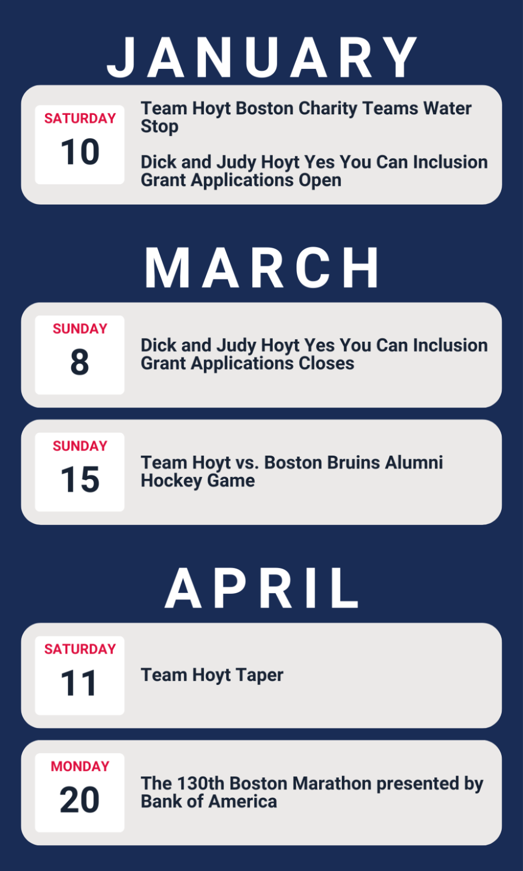 However you take part, we invite you to run, walk, or roll with Team Hoyt this April. Register Here!